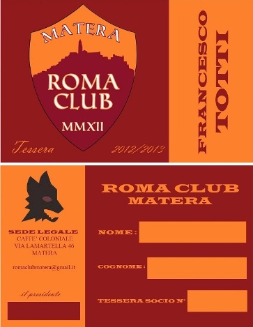 IL DIRETTIVO SI PROPONE PER INCENTIVARE LE ISCRIZIONI, DI COMPRENDERE NEL COSTO DELLA TESSERA UN GADGET, PER L'ANNO SPORTIVO 2012/13 FINO AL 50° ISCRITTO E' COMPRESO LA SCIARPA DEL ROMA CLUB MATERA E LA TESSERA IN PVC.